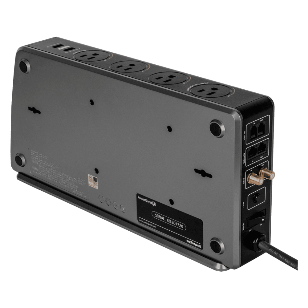 PowerQuest surge protectors and power filters outperform other power products in their class, effectively reducing noise and distortion while seamlessly supporting a wide range of audio and video systems. The PowerQuest 3 takes it a step further, serving as a flexible central power hub for your electronics. With eight outlets, it accommodates a variety of A/V devices, while network and telephone connections provide easy integration for modems, routers, and phone systems. Coaxial cable input/output ports ensure compatibility with cable boxes, and three-prong outlets make the PowerQuest 3 the ideal choice for powering your entire home entertainment setup.